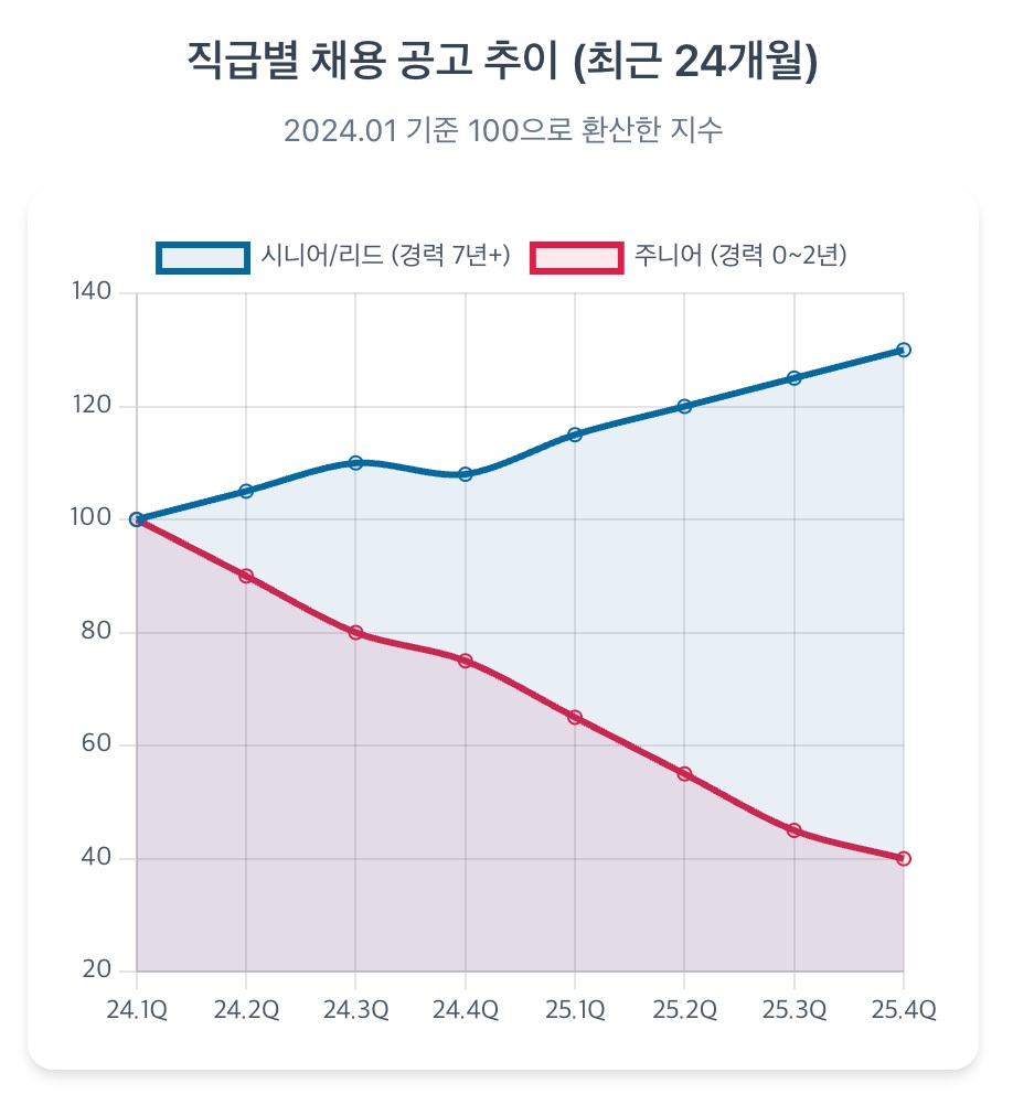 주니어의 위기: 단순 구현 및 반복 업무(Boilerplate, Test Case 작성 등)를 AI가 저렴하게 대체하면서, 한국 내 IT 신입 채용 공고는 전년 대비 18.9%에서 많게는 43%까지 급감했습니다.