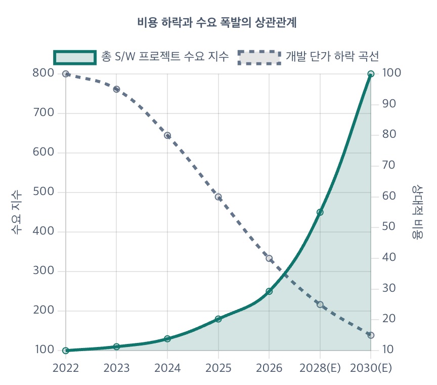 잠재 수요의 현실화: 과거에는 높은 개발 단가 때문에 포기했던 소규모 프로젝트(사내 자동화 툴, 마이크로 SaaS 등)들이 AI 덕분에 경제성을 갖게 되며 시장이 확장됩니다.