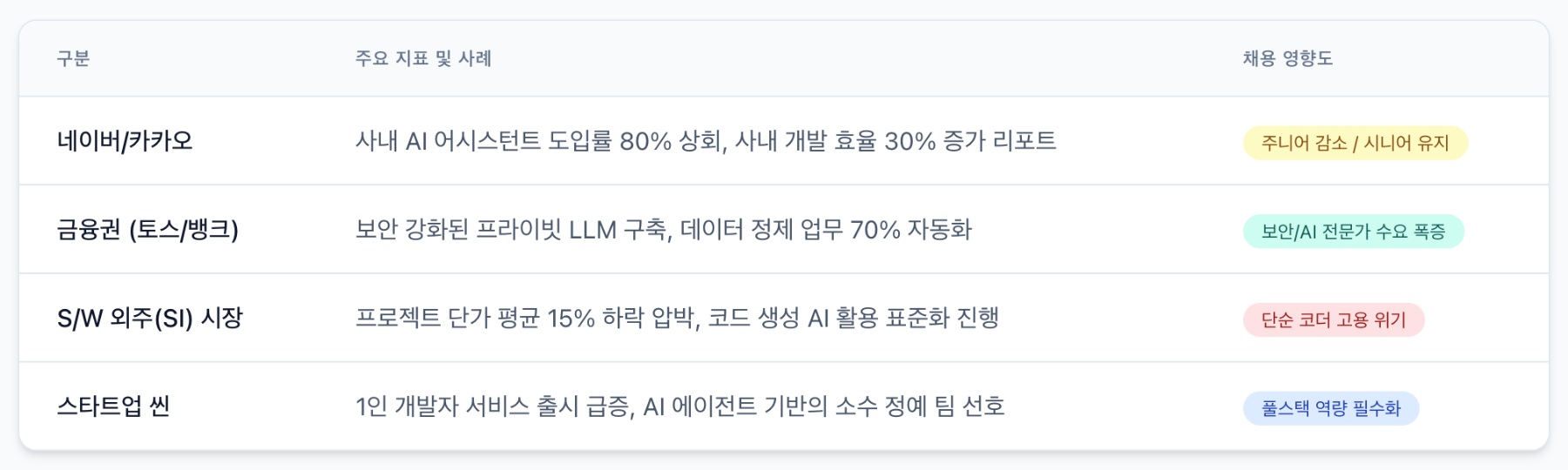 한국 시장 역시 글로벌 흐름과 궤를 같이하고 있습니다. 네이버, 카카오 등 빅테크는 신규 채용을 축소하고 '경력직 수시 채용' 체제로 완전히 전환했습니다. 흥미로운 점은 현대자동차나 삼성SDS 같은 전통적인 대기업들이 AX(AI 전환)를 위해 개발자 채용을 오히려 확대하고 있다는 점입니다.